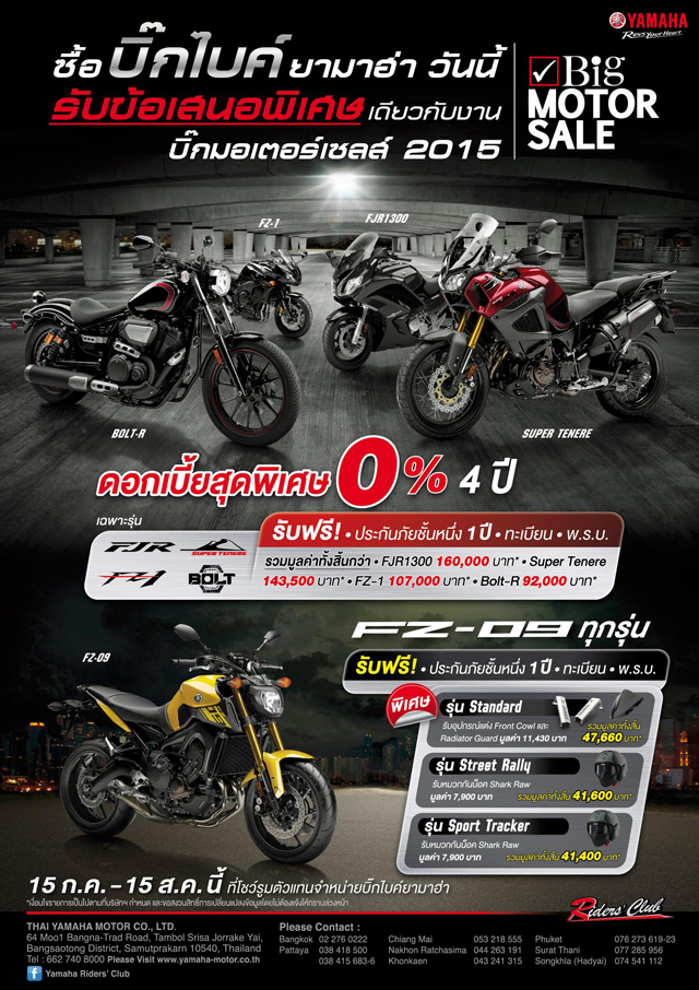 นอกจากนี้ ยามาฮ่า ไรเดอร์ส คลับ ยังได้จัดโปรโมชั่นสุดพิเศษสำหรับลูกค้าที่สนใจรถบิ๊กไบค์ของยามาฮ่าด้วยกันอีกหลายรุ่น ซึ่งมีรายละเอียดดังนี้