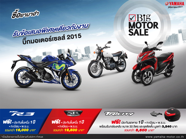 และพบกับข้อเสนอสุดร้อนแรงของ YZF-R3, SR400 และTRICITY ได้ที่ร้านผู้จำหน่ายรถจักรยานยนต์ยามาฮ่า ทั่วประเทศ ตั้งแต่ 15 กรกฎาคม -15 สิงหาคม 2558 เท่านั้น