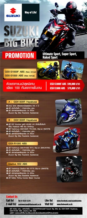 ซูซูกิ ร่วมนำรถจักรยานยนต์หลากหลายรุ่นพร้อมแคมเปญพิเศษมากมาย เช่น Suzuki GD, Suzuki GSX ใหม่ เป็นต้น