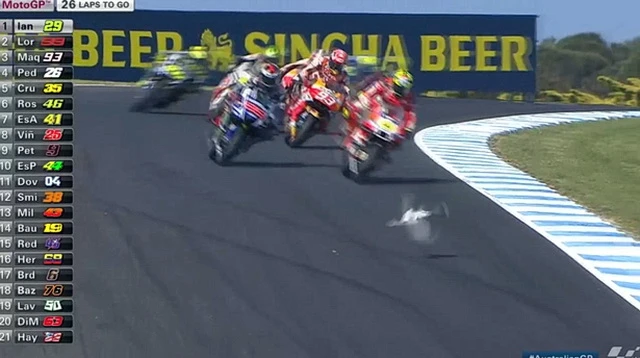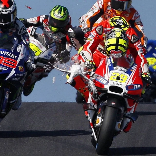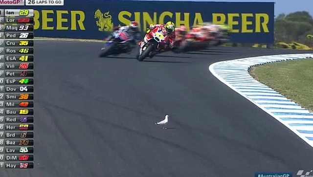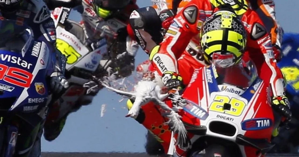 อังเดร เอียโนเน่ นักแข่งทีมดูคาติ ก้มเก็บคอช่วงบิดชนนกนางนวล ระหว่างการแข่งรอบ 2 ของโมโตจีพี รายการออสเตรเลี่ยนจีพี โชคดีที่เหตุการณ์ดังกล่าวไม่ส่งผลกระทบต่อตัวเขาและนักแข่งคนอื่นๆ ที่บิดตามมา