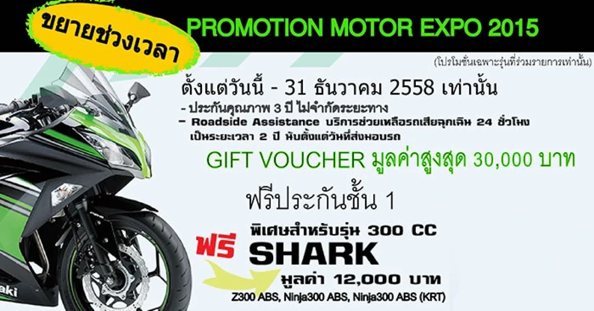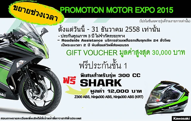 บริษัท คาวาซากิ มอเตอร์ เอ็นเตอร์ไพรส์ (ประเทศไทย) จำกัด ขอขอบพระคุณทุกท่านที่ให้ความสนใจในผลิตภัณฑ์ของเรา บริษัทมีความยินดีเป็นอย่างยิ่งที่จะมอบของสมนาคุณให้แก่ลูกค้าทุกท่าน จึงขอต่อโปรโมชั่นสำหรับงาน Motor Expo 2015 ให้แก่ลูกค้าคาวาซากิ เพื่อเป็นการขอบคุณและตอบแทนที่ท่านได้ให้ความสนใจในผลิตภัณฑ์ โดยโปรโมชั่นนี้ได้ขยายเวลาถึงวันที่ 31 ธันวาคม 2558 บริษัทหวังเป็นอย่างยิ่งว่าทุกท่านจะได้รับโปรโมชั่นนี้และทำให้ท่านเป็นเจ้าของรถจักรยานยนต์คาวาซากิอย่างคุ้มค่าที่สุด