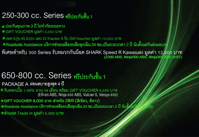 - ฟรีประกันชั้น 1 ทุกรุ่น ตั้งแต่ 250 - 1400 cc (ยกเว้น Ninja ZX-10R , Ninja H2)
