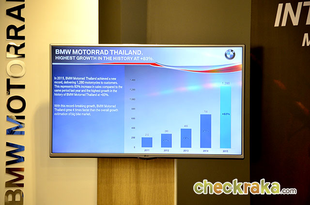 มร.แมทธิอัส พฟาลซ์ ประธาน บีเอ็มดับเบิลยู กรุ๊ป ประเทศไทย กล่าวว่า "ในปี 2558 บีเอ็มดับเบิลยู มอเตอร์ราด สร้างสถิติใหม่ในประเทศไทย ด้วยจำนวนส่งมอบรถมอเตอร์ไซค์ทั้งสิ้น 1,280 คัน เพิ่มขึ้นจากช่วงเดียวกันในปีก่อนหน้าถึง 83 เปอร์เซ็นต์ และเป็นอัตราการเติบโตที่สูงที่สุดของบีเอ็มดับเบิลยู มอเตอร์ราด ประเทศไทย ซึ่งคิดเป็น 4 เท่าของอัตราการเติบโตของตลาดบิ๊กไบค์โดยประมาณทั้งหมด"