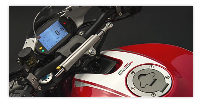 โช้กหน้าแบบหัวกลับของ Ohlins ด้านหลังสวิงอาร์มแขนเดี่ยวพร้อมโช้กจาก Ohlins เช่นกัน ดิสก์เบรกคู่หน้าแบบ 2 ลูกสูบ จานขนาด 330 มิลลิเมตร และหลังเดี่ยวแบบลูกสูบคู่ จานขนาด 245 มิลลิเมตร พร้อม ABS จอมาตรวัดดิจิทัลแบบ TFT แสดงผลอัจฉริยะ ความสูงเบาะ 829 มิลลิเมตร ความจุถังน้ำมัน 17.5 ลิตร