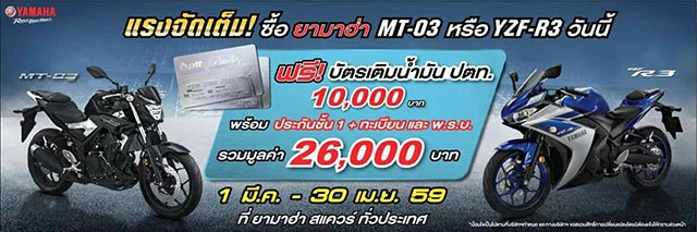 บริษัท ไทยยามาฮ่ามอเตอร์ จำกัด กระตุ้นยอดจำหน่ายส่งท้ายไตรมาสแรกด้วยโปรโมชั่นสุดเร้าใจ โดยผู้ที่ซื้อรถจักรยานยนต์ยามาฮ่า YZF-R3 หรือ MT-03 จะได้รับบัตรเติมน้ำมันมูลค่า 10,000 บาท พร้อมประกันภัยชั้น 1 + ทะเบียน + พ.ร.บ. รวมมูลค่า 26,000 บาท ฟรีทันที!! ที่ยามาฮ่า สแควร์ทั่วประเทศ และสำหรับผู้ที่ซื้อรถจักรยานยนต์ยามาฮ่า GT125 จะได้รับหมวกกันน็อคแบบ JET สุดเท่ มูลค่า 700 บาท ฟรี!! ที่ร้านจำหน่ายยามาฮ่า ในเขตกรุงเทพฯ และปริมณฑลเท่านั้น