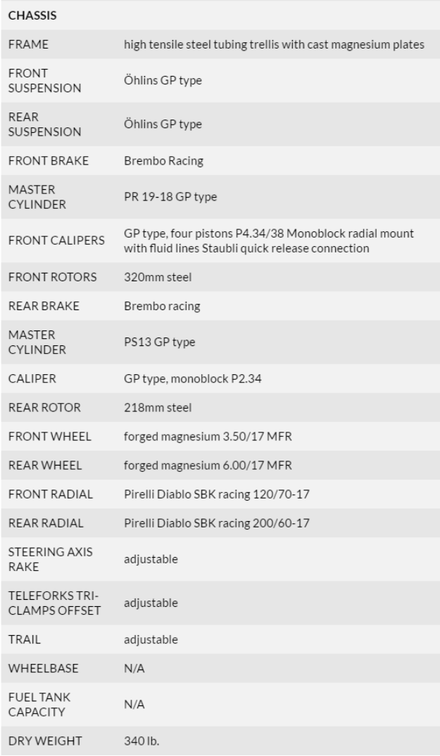 T12 Massimo น้ำหนักขณะไม่เติมเชื้อเพลิงเพียง 340 ปอนด์ (ประมาณ 154.22 กิโลกรัม) ให้กำลังสูงสุด 230 แรงม้า สวิงอาร์มและครอบล้อทำจาก magnesium castings แข็งแรงและปลอดภัย T12 รับผลิตแบบ made to order ราคาอยู่ที่ 300,000 ยูโร (ประมาณ 15,745,980 บาท อัตราแลกเปลี่ยน ณ วันที่ 20 พฤษภาคม 2559 ข้อมูลจากธนาคารแห่งประเทศไทย)