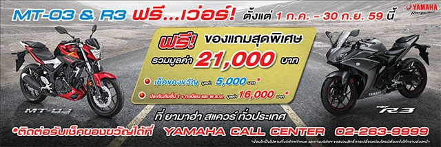 บริษัท ไทยยามาฮ่ามอเตอร์ จำกัด ขยายเวลาในการจัดโปรโมชั่นสุดพิเศษ "MT-03 และ YZF-R3 รับฟรี...เวอร์!" เพื่อเป็นการคืนกำไรให้แก่ลูกค้า เมื่อซื้อรถจักรยานยนต์ยามาฮ่ารุ่น MT-03 และ YZF-R3 รับทันทีของแถมสุดพิเศษรวมมูลค่า 21,000 บาท ได้แก่