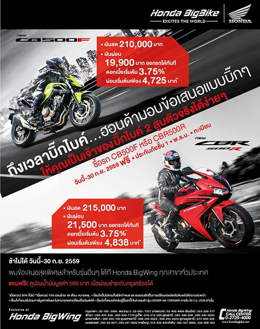 เอ.พี. ฮอนด้า ผู้จัดจำหน่ายรถฮอนด้าบิ๊กไบค์ในประเทศไทย มอบข้อเสนอสุดพิเศษเอาใจคนรัก Honda CB500F และ CBR500R ด้วยดอกเบี้ยเริ่มต้นเพียง 3.75% และข้อเสนอพิเศษอีกมากมายอาทิ CB500F ดาวน์เริ่มต้นเพียง 19,900 บาท หรือเลือกดาวน์ต่ำเพียง 10% ผ่อนชำระ 48 เดือน (เพียงเดือนละ 4,725 บาท) และ CBR500R ดาวน์เริ่มต้นเพียง 21,500 บาท หรือเลือกดาวน์ต่ำเพียง 10% ผ่อนชำระ 48 เดือน (เพียงเดือนละ 4,838 บาท) ทั้งสองรุ่นรับฟรีประกันภัยชั้น 1, ฟรี พรบ. และฟรีค่าจดทะเบียน ตั้งแต่วันนี้ถึง 30 กันยายนนี้ ที่ศูนย์ฮอนด้าบิ๊กวิงทั่วประเทศ