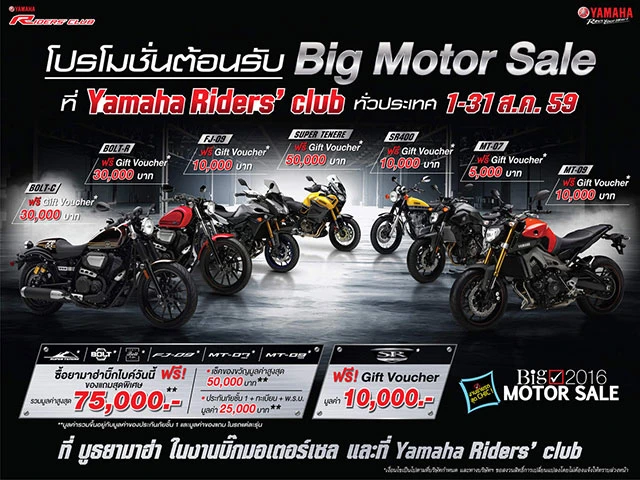 - จอง Super Tenere, FJ-09, Bolt, MT-09 และ MT-07 ฟรี ประกันภัยชั้น 1, ทะเบียน, พ.ร.บ. และ Gift Voucher มูลค่า 5,000-50,000 บาท