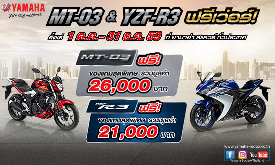 บริษัท ไทยยามาฮ่ามอเตอร์ จำกัด ขยายระยะเวลาจัดโปรโมชั่นสุดพิเศษ "MT-03 & YZF-R3 ฟรี...เว่อร์!" เพื่อคืนกำไรให้ลูกค้า เมื่อซื้อรถจักรยานยนต์ยามาฮ่ารุ่น MT-03 รับทันทีของแถมสุดพิเศษรวมมูลค่า 26,000 บาท และเมื่อซื้อรถจักรยานยนต์ยามาฮ่ารุ่น YZF-R3 รับทันทีของแถมสุดพิเศษรวมมูลค่า 21,000 บาท