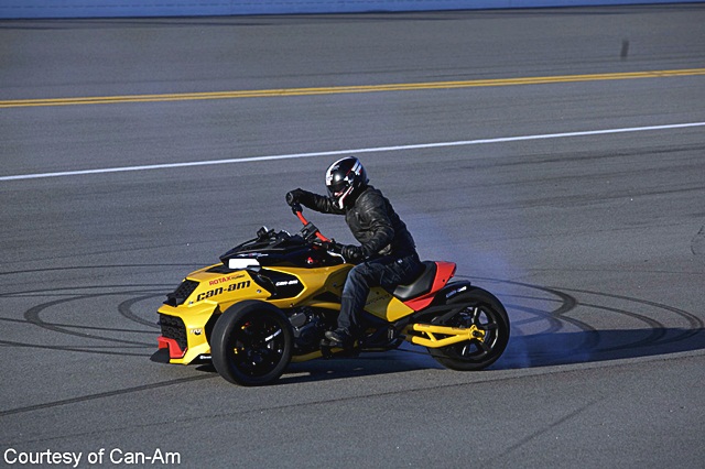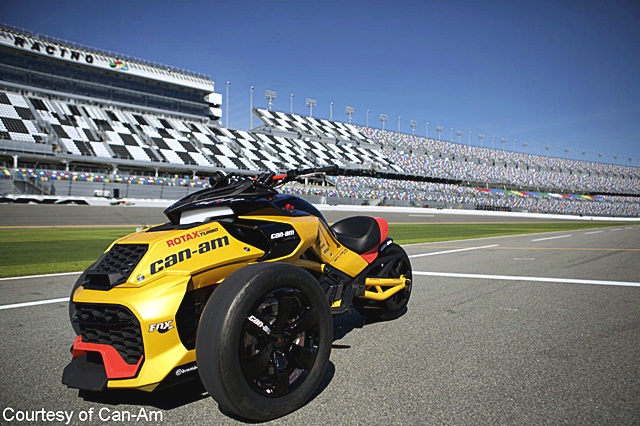 Spyder F3 Concept มอเตอร์ไซค์ 3 ล้อ ผลผลิตจากทีมแข่ง Can-Am NASCAR หรือ Can-Am's parent company สปอนเซอร์รายใหญ่ให้กับรถแข่ง Nascar พร้อมโชว์หลังใน Daytona International Speedway