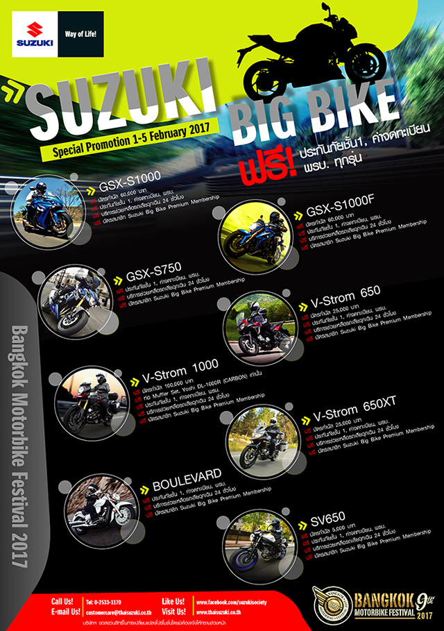 รีบไปสัมผัสตัวจริงของจักรยานยนต์ซูซูกิได้ที่บูธ SUZUKI BIG BIKE ที่งาน "Bangkok Motorbike Festival 2017" ได้ตั้งแต่วันนี้จนถึงวันที่ 5 กุมภาพันธ์ 2560 ชั้น G ศูนย์การค้าเซ็นทรัลเวิลด์ (ราชประสงค์)
