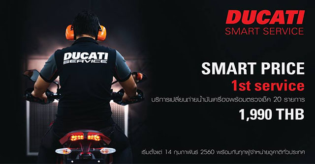 ทั้งนี้ ดูคาติไทยแลนด์ได้ปรับกลยุทธ์ทางการตลาดครั้งใหญ่ มุ่งเน้นไปที่การบริการหลังการขายรูปแบบใหม่ นั่นคือการมอบอภิสิทธิ์พิเศษของ Ducati Smart Service Package ให้ลูกค้าดูคาติทุกท่าน เป็นการปรับโครงสร้างราคาอะไหล่และการตรวจเช็คตามระยะ ให้สอดคล้องกับราคาของรถ Ducati ที่จำหน่ายในประเทศไทย เพื่อไร้กังวลเรื่องค่าใช้จ่ายในการบำรุงรักษา
