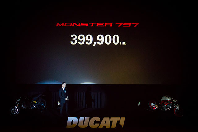 และในวันนี้ ทางดูคาติไทยแลนด์ได้มีการนำรถดูคาติรุ่นใหม่ล่าสุดมาเปิดตัวในเมืองไทยที่นี่เป็นครั้งแรก นั่นคือ นิว มอนสเตอร์ 797 (New Monster 797) ซึ่งจะเป็น Urban Icon สืบสานตำนานอันยิ่งใหญ่ของ Monster ที่มีมากว่า 20 ปี ด้วยเครื่องยนต์แบบ Air-Cool ขนาด 803 ซีซี มาพร้อมกับถังน้ำมันเหล็ก และ trellis frame ที่ออกแบบให้มีความปราดเปรียวเหมือนกับ Monster คันแรก ซึ่ง New Monster 797 จะมีทั้งหมด 3 สี คือ สีแดง Ducati Red, สีขาว Star White Silk และสีดำ Dark Stealth โดยราคาช่วงเปิดตัวสำหรับ Monster 797 Ducati Red อยู่ที่ 399,900 บาท (จากราคาปกติ 409,900 บาท) สำหรับราคาช่วงเปิดตัวของ Monster 797 Star White Silk และ Dark Stealth อยู่ที่ 409,900 บาท (จากราคาปกติ 419,900 บาท)