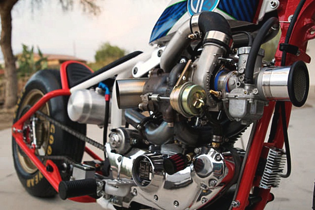 โดยใช้พื้นฐานจาก Harley-Davidson รุ่น Ironhead Sportster ปี 1979 เครื่องยนต์ V-Twin 1,000 ซีซี จ่ายน้ำมันด้วยคาร์บูเรเตอร์ ซึ่งเป็นงานถนัดของสำนักนี้ เอามาจับแยกชิ้นส่วน ออกแบบผลิตใหม่ทั้งคัน โดยเฉพาะส่วนของเครื่องยนต์ที่ติดตั้งเทอร์โบเข้าไป พร้อมทำ "ไส้" ในใหม่ ทั้งลูกสูบ Forged วาล์ว สปริงวาล์ว รวมถึงท่อไอดี-ไอเสียอลูมิเนียม และสิ่งที่ยากคือ การปรับจูนให้คาร์บูเรเตอร์จ่ายน้ำมันให้เพียงพอต่อการ "บูสต์" โดยการติดตั้งในตำแหน่งปากทางดูดอากาศโดยตรง หมดกังวลเมื่อบิดหมดปลอก!