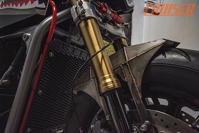ผู้สร้าง Gold Wing คันนี้ต้องการความแตกต่าง และเห็นว่าสามารถจะทำให้เป็นรถสไตล์อื่นได้ ไม่จำเป็นต้องหรูอย่างเดียว จึงเริ่มนำชิ้นส่วนต่างๆ ที่เป็นโลหะ มาปะติดปะต่อกันเป็นถังน้ำมัน กันโคลนล้อหน้า ชุดโช้กหน้าใช้ของ Suzuki GSX-R และโช้กหล้งใช้ของ KYB