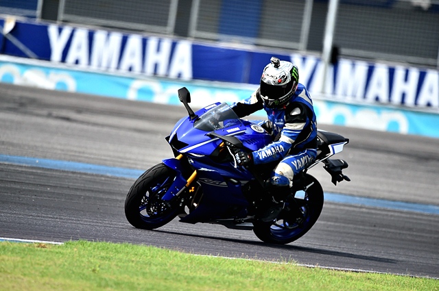 หลังครบ 2 รอบ สนามก็เข้าพิต ผู้เขียนขยับขึ้นมาคร่อม YZF-R6 นับเป็นการได้สัมผัส R6 เป็นครั้งแรกตั้งแต่วันเปิดตัว ด้วยรูปทรงซูเปอร์สปอร์ตที่สวยงามไม่แพ้รุ่นพี่ R1 ตลอดจนมีเทคโนโลยีทันสมัยที่สุด โดยเฉพาะ Quick Shift System ที่สามารถงัดเกียร์ขึ้นได้โดยไม่ต้องบีบคลัตช์ เมื่อนั่งคร่อมเรียบร้อยท่านั่งที่โน้มต่ำลาดไปด้านหน้า ทำให้ความรู้สึกของผู้เขียนเปลี่ยนไปอย่างชัดเจนจากที่นั่งหลังตรงขี่ TMAX มา ทันทีที่เริ่มออกตัวสู่สนามรอบเกียร์ต่ำมีพลังและช่วงยาวให้ได้ใช้อย่างน่าพอใจ เมื่อลากรอบขึ้นไปพลังระดับ 118 แรงม้า ก็พาผู้เขียนทะยานไปข้างหน้าอย่างรวดเร็วการเบนเข้าโค้งทำได้สนุกและมั่นใจมาก นับเป็นการเข้าโค้งผ่านจุด Apex ที่ได้อรรถรสที่สุดนับตั้งแต่ลองรถในสนามแห่งนี่้มาหลายครั้ง ตัวรถให้การควบคุมดีเยี่ยม การพลิกเข้าโค้งต่อโค้งเป็นไปอย่างไหลลื่น เมื่อถึงช่วงทางตรง ผู้เขียนได้โอกาสลองทำความเร็วต่อเนื่องจากเกียร์ต่อเกียร์ พบว่าการส่งถ่ายกำลังของ R6 ให้พลังที่ดีอย่างต่อเนื่องและราบรื่นมาก เมื่อเบรกที่สุดทางตรงก่อนเข้าโค้งขวาใหม่ก็ได้ความรู้สึกตอบกลับที่ดีและมั่นใจ รวมแล้วประทับใจสมรรถนะโดยรวมของ Yamaha R6 ใหม่ จริงๆ ส่วนหนึ่งก็เพราะเป็นการขี่ในแทร็ค ซึ่งเหมาะสมและช่วยให้ R6 แสดงความสามารถได้ชัดเจนกว่าบนถนนทั่วไป นับเป็นซูเปอร์สปอร์ตไบค์ที่นักขี่หัวใจสปอร์ตควรมีเป็นอย่างยิ่ง ด้วยราคาเพียง 549,000 บาท พร้อม 2 สีให้เลือก น้ำเงิน และดำ