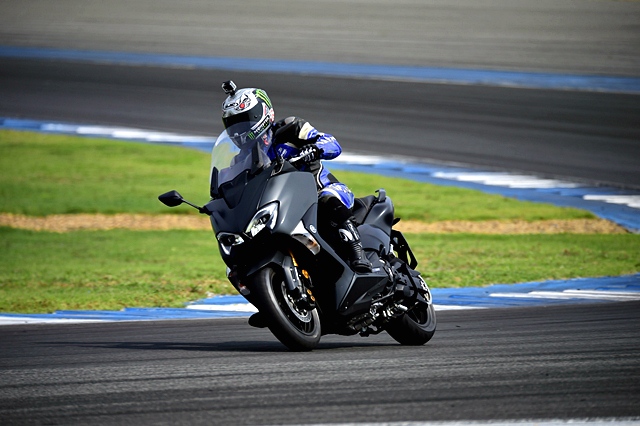 ผู้เขียนได้ขี่ TMAX SX - Reset the rules of MAX เป็นรุ่นแรก ซึ่งเป็นโฉมใหม่หมด การขี่สกู๊ตเตอร์ขนาดใหญ่บนแทร็คนับเป็นประสบการณ์ใหม่ ด้วยพลังระดับ 45 แรงม้า อาจดูน้อยไปสำหรับขี่เอาสนุกในสนาม เมื่อได้ลอง 2 รอบ อาจน้อยไป แต่พอบอกได้ว่า TMAX เป็นรถที่ให้ความสบาย ขี่ได้อย่างมั่นใจการผ่านเข้าโค้งต่อโค้ง ระบบกันสะเทือนนุ่มนวล แต่ยึดเกาะดีพอ ด้วยการใช้โช้คหัวกลับ และกันสะเทือนหลังแบบ Link type สำหรับ TMAX SX โฉมล่าสุดมี 2 สีให้เลือก เทา และดำ ราคา 499,000 บาท
