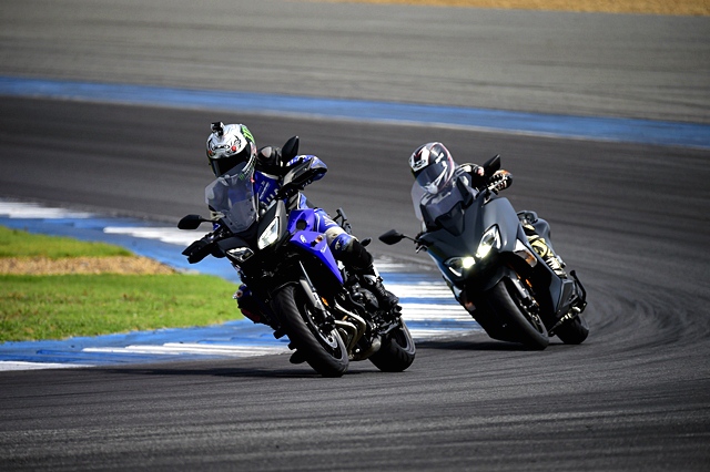 การทดสอบแบ่งออกเป็น 8 กลุ่ม กลุ่มละ 5 คน เท่ากับจำนวนรถที่เตรียมไว้ให้ 5 รุ่น คือ MT-10, MT-09, MT-09 TRACER, R6 และ TMAX โดยรูปแบบการทดสอบเป็นแบบเต็มรอบสนาม มีวางกรวยดักความเร็วไว้ที่โค้งสุดท้ายก่อนเข้าทางตรงยาว ผู้ทดสอบทั้ง 5 คนในแต่ละกลุ่มเลือกรุ่นรถคันแรกกันตามสะดวก เพราะเป็นการวนจนทุกคนขี่ครบทุกรุ่น และกำหนดไว้ให้ขี่รุ่นละ 2 รอบสนาม จึงเข้าพิตสลับรถจนครบ ผู้เขียนอยู่ในกลุ่มแรกเริ่มการทดสอบกันในช่วงเวลาประมาณ 9.30 น. โดยเริ่มจากคันสุดท้ายคือ TMAX ซึ่งเป็นสกู๊ตเตอร์พรีเมียมรุ่นล่าสุดที่เพิ่งเปิดตัวไปในงานมอเตอร์โชว์ที่ผ่านมา นับเป็นการเริ่มต้นที่สบายในการทำความคุ้นเคยกับสนาม จริงๆ ผู้เขียนเคยมาขับรถในสนามนี้หลายครั้ง จึงคุ้นเคยกับไลน์ของสนามพอสมควร แต่สำหรับการขี่มอเตอร์ไซค์ในสนามนับเป็นครั้งแรกจริงๆ จึงเน้นการขี่แบบจับความรู้สึกและการตอบสนองของตัวรถมากกว่าทำความเร็ว ซึ่งตรงกับความตั้งใจของทางยามาฮ่าผู้จัด