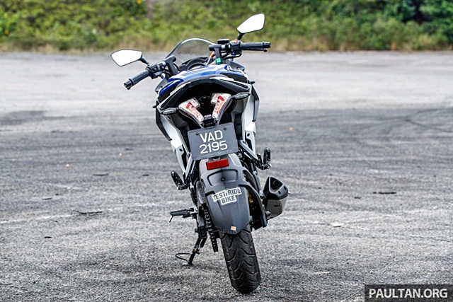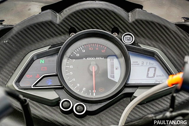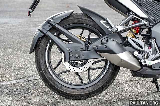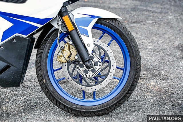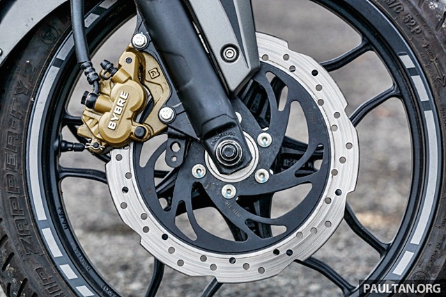 ระบบเบรกจานหน้าขนาด 300 มิลลิเมตร จานหลัง 280 มิลลิเมตร และคาลิปเปอร์จาก BYBRE ลูกหม้อของ Brembo พร้อม ABS เฉพาะรุ่น RS200