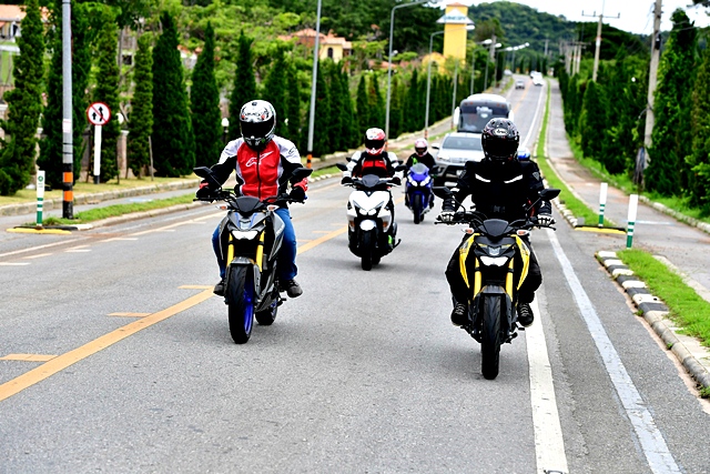 ขบวนฯ มาถึงหาดนางรำ สัตหีบ พร้อมพักรับประทานอาหารกลางวัน และดื่มด่ำกับบรรยากาศสุดชิลริมทะเล สะท้อนให้เห็นว่ามอเตอร์ไซด์คลาส 150 ซีซี ก็ใช้ขี่ทางไกล ท่องเที่ยวได้แบบสบายๆ โดยเฉพาะ R15 ใหม่ ที่ขี่แล้วดูดีตลอดการเดินทางจริงๆ เวลาไปจอดพักที่ไหนก็มักได้รับความสนใจจากผู้พบเห็น หลังจากหนังท้องตึงหนังตาหย่อนไปกับสายลมชายทะเล ขบวนฯ ก็ต้องออกเดินทางกันต่อเพื่อไปทำกิจกรรมปลุกประสาทสัมผัสอย่าง บีบีกัน ที่ค่ายพระมหาเจษฎาราชเจ้า ในกองพลนาวิกโยธิน สมาชิกขี่กันมา 8 คน แบ่งทีมกันได้พอดี และได้เจ้าหน้าที่มาช่วยสมทบอีกฝั่งละคน ทำให้เกมสาดกระสุนเข้มข้นเร้าใจมากขึ้น หลังจากใช้เวลาผลาญแคลอรี่กันเกือบ 2 ชั่วโมง ก็ได้เวลาเดินทางกันต่อเพื่อเข้าที่พักแถวอ่างเก็บน้ำมาบประชัน ส่วนผู้เขียนสลับมาขี่ยามาฮ่า NMAX ซึ่งเป็นสกู๊ตเตอร์สปอร์ตเมติก ขี่ด้วยท่านั่งสบายสุดๆ หลังจากขี่ยาวๆ บอกได้เลยว่าชอบที่ความนุ่มแต่หนึบของช่วงล่าง กำลังแรงดี และคล่องตัวมาก ยกให้เป็นมอเตอร์ไซค์ดีแบบ all round รุ่นหนึ่งเลย