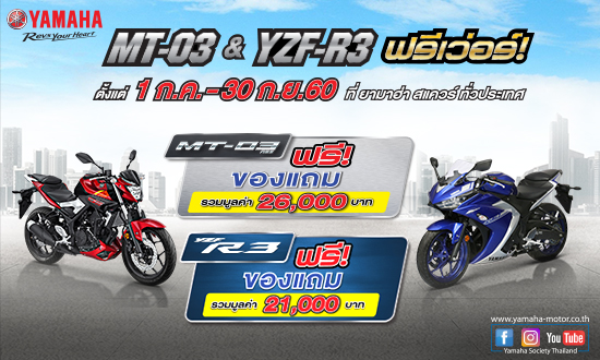 บริษัท ไทยยามาฮ่ามอเตอร์ จำกัด ขยายระยะเวลาส่งเสริมการขายจัดกิจกรรมคืนกำไรให้แก่ลูกค้าที่ซื้อรถจักรยานยนต์ YAMAHA MT-03 อัศวินแห่งรัตติกาล สัญชาตญาณตระกูล MT ซีรีส์ สมรรถนะสูงด้วยขุมกำลัง 321 ซีซี รับทันทีของแถมสุดพิเศษรวมมูลค่า 26,000 บาท และลูกค้าที่ซื้อรถจักรยานยนต์ YAMAHA YZF-R3 ท่วงทำนองแห่งความเร้าใจ ทุกโสตสัมผัสแห่งการขับเคลื่อนที่เป็นเอกลักษณ์ ความแรงเหนือชั้นแห่งยนตรกรรมสายพันธุ์แชมป์โลก สายพันธุ์ R-Series รับทันทีของแถมสุดพิเศษรวมมูลค่า 21,000 บาท Yamaha MT-03 และ YZF-R3 พร้อมให้ทุกท่านได้เป็นเจ้าของ ด้วยของแถมสุดพิเศษแล้ว ตั้งแต่วันที่ 1 กรกฎาคม - 30 กันยายน 2560 นี้
