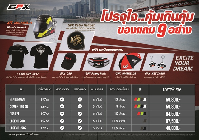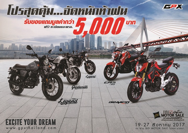 GPX จัดหนัก จัดเต็ม ขนมาแบบเต็มๆ ทั้งรถ ทั้งโปรโมชั่น เพียงจองรถ GPX ทุกรุ่นในงาน BIG Motor Sale 2017 ใช้เงินจองแค่ 1,000 บาท รับโปรฯ สุดคุ้ม...จัดหนักท้าฝน ไปเลย! ของแถมรวมมูลค่ากว่า 5,000 บาท