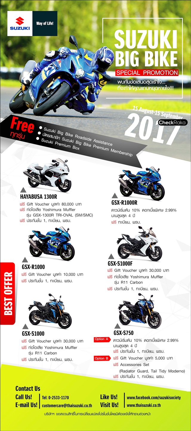 Suzuki ขนทัพมอเตอร์ไซค์ครบทุกเซกเมนต์มาให้สัมผัสพร้อมแคมเปญพิเศษสุดๆ ในงาน Big Motor Sale 2017 ที่ไบเทค บางนา วันที่ 19 - 27 ส.ค. 2560 นี้ มาพร้อมโปรโมชั่นสะใจ