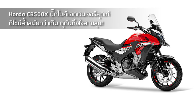 บริษัท เอ.พี. ฮอนด้า จำกัด ผู้จัดจำหน่ายรถจักรยานยนต์ฮอนด้าบิ๊กไบค์ในประเทศไทย เปิดตัวNew Honda CB500X รถบิ๊กไบค์แบบแอดเวนเจอร์ ดีไซน์โครงสร้างด้านข้างและกราฟิกใหม่ ให้ทั้งความปราดเปรียวและความดุดันยิ่งขึ้นกว่าเดิม ไฟหน้าและไฟท้ายดีไซน์ใหม่แบบ LED พร้อมฟังก์ชันการใช้งานที่โดนใจคนชอบลุย ไม่ว่าจะเป็นวินชีลด์ที่สูงขึ้นและถังน้ำมันที่จุได้มากขึ้น โช้กหน้าและก้านเบรกปรับระดับได้ พร้อมวางจำหน่ายแล้วที่ศูนย์ Honda Bigwing ทั่วประเทศ ตั้งแต่วันนี้เป็นต้นไป