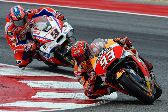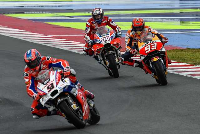 หลังจากนั้นเกมการแข่งขันก็ดูจะเป็นการห้ำหั่นกันระหว่าง เปตรุซซี กับ มาร์เกซ ปล่อยให้ โดวิซิโอโซ ตามมาโดยมีระยะห่างพอสมควร ซึ่งก็ดูว่านักแข่งจาก Ducati น่าจะพอใจกับอันดับที่ 3 เนื่องจากไม่ต้องการที่จะเสี่ยงมากเกินไปจนพลาดคะแนนสะสมไปอีกคนหลังจาก ลอเรนโซ่ พลาดล้มในช่วงต้นของการแข่งขัน อันดับยังคงตามนี้ไปเรื่อยๆ นั่นคือ เปตรุซซี, มาร์เกซ และโดวิซิโอโซ่ เรียงตามลำดับ จนเมื่อถึงรอบสุดท้ายของการแข่งขันในสนามนี้ มาร์เกซ ก็แผลงฤทธิ์อีกครั้ง ด้วยการแซงผ่าน เปตรุซซี จนขึ้นไปเป็นผู้นำและเข้าเส้นชัยเป็นคันแรกด้วยเวลา 50'41.565 นาที เฉือนชนะ เปตรุซซี ที่ 2 เพียง 1.192 วินาทีเท่านั้น ส่วนอันดับ 3 ก็เป็น โดวิซิโอโซ ตามมาด้วยเวลา 11.706 วินาที
