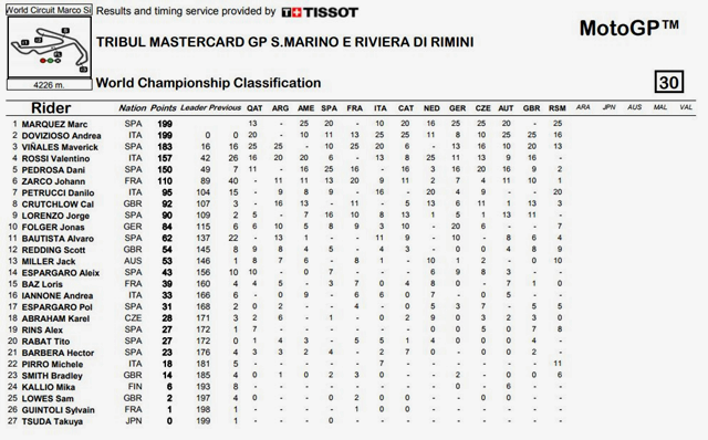จบการแข่งขันสนามที่ 13 ตารางคะแนนสะสมประจำปีกลับมามีลุ้นอีกครั้ง เมื่ออันดับผู้นำมีคะแนน 199 คะแนนเท่ากัน นั่นก็คือ มาร์เกซ และ โดวิซิโอโซ ตามมาด้วย บีญาเลส ทางด้านแฟนๆ ของ "The Doctor" วาเลนติโน่ รอซซี่ นั้นหลังจากที่ได้รับอาการบาดเจ็บทำให้พลาดการแข่งขันในสนามนี้ ก็มีทีท่าจากทางทีมว่าจะมีนักแข่งสำรองมาเสียบแทนในสนามหน้า ซึ่งจะเป็นใครยังไงนั้นคงต้องรอติดตาม ก็หวังว่านักบิดจอมเก๋าอย่าง รอซซี่ จะหายเร็วๆ และกลับมาโชว์ลีลาให้ได้เห็นอีกครั้งในเร็ววัน