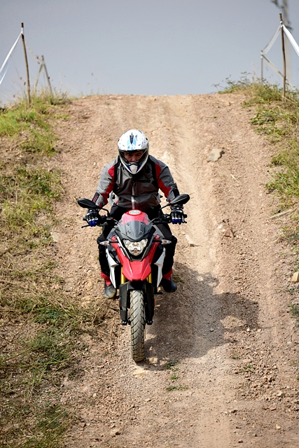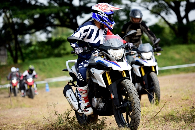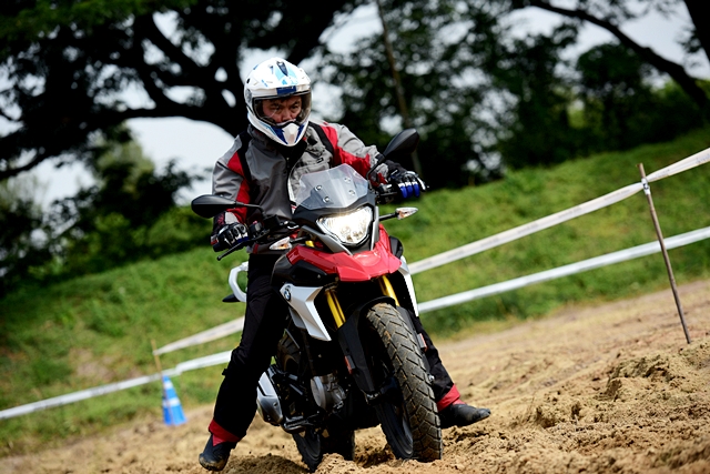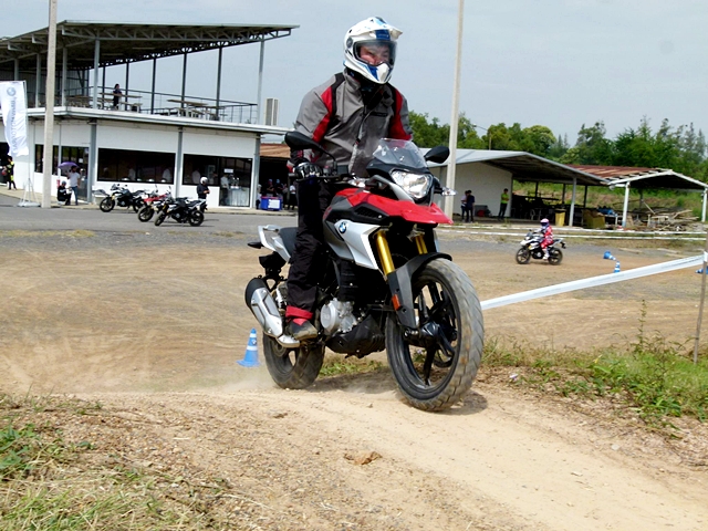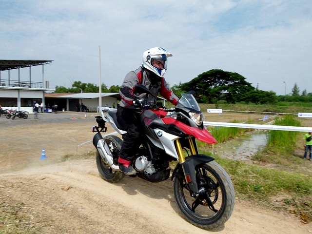 ในช่วงแรกผู้ฝึกสอนยังขี่นำกลุ่มเพื่อให้คุ้นเคยกับเส้นทางและอุปสรรค จากนั้นจึงปล่อยอิสระโดยขี่ทวนเข็มนาฬิกา การขี่ทดสอบใช้เวลาทั้งหมดราวครึ่งชั่วโมง แต่มีเบรกช่วง 15 นาที แม้ใช้เวลาไม่มากในการขี่แต่ก็นับว่าเต็มที่ตลอด เพราะเป็นการขับขี่บนเส้นทางอุปสรรคต่อเนื่อง ทำให้ต้องเน้นไปที่การบังคับควบคุมอยู่ตลอดเวลา ด้วยอุปสรรค เช่น เนินดินต่างระดับ ทางดินร่วน พื้นรากต้นไม้ สลาลอม และเนินสูง G 310 GS ก็ตะลุยผ่านทุกอุปสรรคแบบสบายๆ และให้ความสนุกกับการขี่สไตล์เอนดูโร่เบาๆ ผู้เขียนประทับใจในสมรรถนะโดยรวม โดยเฉพาะการขี่ผ่านทางดินร่วนที่ผ่านไปได้สบายๆ ส่วนหนึ่งเพราะเป็นยางแบบดูอัลสปอร์ต และระยะเคลียร์แลนซ์ใต้ท้องที่สูงกำลังดี พอสรุปได้ว่า G 310 GS เป็นมอเตอร์ไซค์ มินิแอดเวนเจอร์ที่เหมาะกับผู้เริ่มต้นหรือใครที่อยากได้มอเตอร์ไซค์ท่องเที่ยวขี่สนุก ควบคุมง่าย ราคาไม่แพง ถ้าจะเปรียบเทียบกับรถก็เสมือนว่า BMW G 310 GS เป็นมินิครอสโอเวอร์ไบค์นั่นเอง