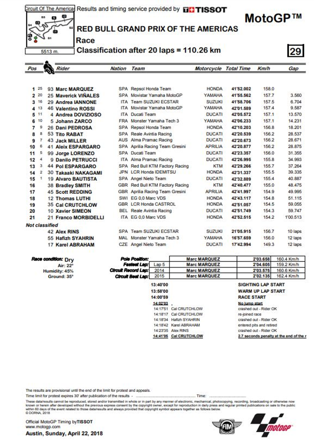 อย่างไรก็ดีการปรับโทษดังกล่าวดูจะไม่เป็นปัญหากับ Marquez มากนัก เพราะหลังจากสตาร์ท Marquez ก็ชิงจังหวะออกตัวเบียดแซง Zarco จาก Monster Yamaha Tech 3, Iannone จาก Team Suzuki Ecstar และ Vinales จาก Movistar Yamaha MotoGP มารั้งตำแหน่งจ่าฝูงพร้อมทิ้งห่างไปเรื่อยๆ ตลอด 20 รอบของการแข่งขัน