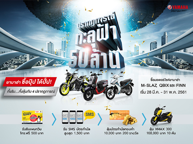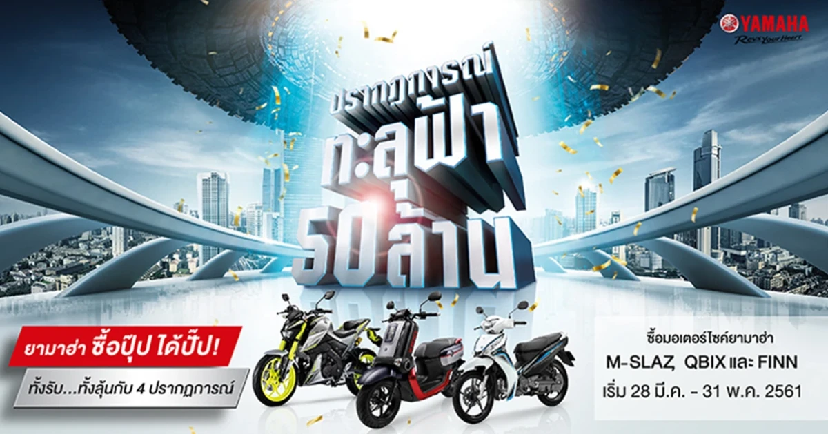 บริษัท ไทยยามาฮ่ามอเตอร์ จำกัด จัดโปรโมชั่นสุดพิเศษ ภายใต้แคมเปญ ยามาฮ่าสร้าง ปรากฏการณ์ทะลุฟ้า 50 ล้าน ซื้อปุ๊ป ได้ปั๊ป ทั้งรับ ทั้งลุ้น! เพียงซื้อรถจักรยานยนต์ยามาฮ่า M-Slaz, QBIX และ FINN รุ่นใดก็ได้ ระหว่างวันที่ 28 มี.ค. 61 - 31 พ.ค. 61 นี้ รับโปรโมชั่นสุดพิเศษดังนี้