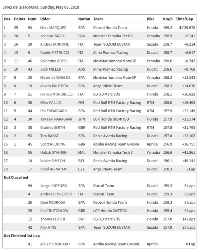 การแข่งขันรถจักรยานยนต์ทางเรียบชิงแชมป์โลก MotoGP 2018 เดินทางเข้าสู่การแข่งขันในโซนยุโรป ซึ่งก็เพิ่งผ่านพ้นไปกับการแข่งขันสนามที่ 4 ในรายการ Gran Premio Red Bull De Espana ที่สนาม Jerez ประเทศสเปน ในรอบควอลิฟายในสนามนี้ Crutchlow ทีม LCR Honda Castrol ที่ทำเวลามาอันดับ 1 คว้าตำแหน่งโพลโพซิชั่นไปได้ด้วยเวลา 1'37.653 ตามมาด้วย Pedrosa และ Zarco ส่วนแถวสอง เป็น Lorenzo, Marquez และ Rins ด้านพ่อหมอ Rossi นั้นได้ตำแหน่งสตาร์ทอันดับ 10 ออกสตาร์ทในแถวที่ 4 โดยการแข่งขันที่สนาม Jerez นี้แข่งกันทั้งหมด 25 รอบ คิดเป็นระยะทาง 110.575 กิโลเมตร