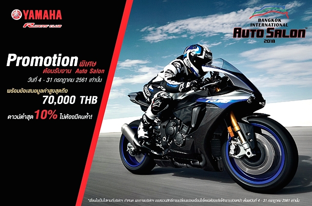 ยามาฮ่า ร่วมงานออโตซาลอน 2018 พร้อมออกบูธด้วยคอนเซปต์ Yamaha Riders' club ณ อาคารชาเลนเจอร์ ฮอลล์ 2 อิมแพ็ค เมืองทองธานี โดยงานนี้นำบิ๊กไบค์ R-Series และ MT-Series โชว์เต็มพื้นที่พร้อมข้อเสนอสุดพิเศษมากมาย ระหว่าง 4 - 8 กรกฎาคม 2561 ณ อาคารชาเลนเจอร์ ฮอลล์ 2 อิมแพ็ค เมืองทองธานี