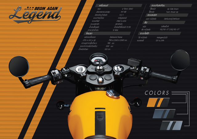 Legend 200 โฉมใหม่ Minor Change 2018 มีให้เลือกทั้ง 3 เฉดสีใหม่ บนเนื้อผิวพิเศษแบบด้าน ได้แก่ สี Army Gold (เหลือง), Blue Navy (ฟ้า) และ Black Night (ดำ) สนนราคาแนะนำขายเพียง 68,500 บาท เท่านั้น! ซึ่งเมื่อเทียบกับฟังก์ชันที่ให้มา เรียกได้ว่าคุ้มกว่านี้ไม่มีอีกแล้ว!