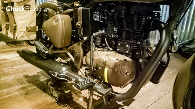 รอยัลเอนฟิลด์ คลาสสิก 500 เพกาซัส (Royal Enfield Classic 500 Pegasus) มาพร้อมกระเป๋าข้างสไตล์มิลิทารี่ ทำจากผ้าแคนวาสและปักด้วยโลโก้เพกาซัส รถถูกออกแบบในสไตล์มิลิทารี่เช่นเดียวกัน โดยเริ่มจากไฟหน้าดวงใหญ่ทรงกลมครอบไฟด้วยสายรัดสีดำ มาตรวัดทรงกลมแยกฟังก์ชั่นต่างๆ แฮนด์จับสีน้ำตาล สายรัดหนังพร้อมหัวทองเหลืองบนตัวกรองอากาศ ท่อไอเสีย ล้อ คันสตาร์ท แป้นเหยียบ สะท้อนสไตล์แบบยุคสงครามโลก