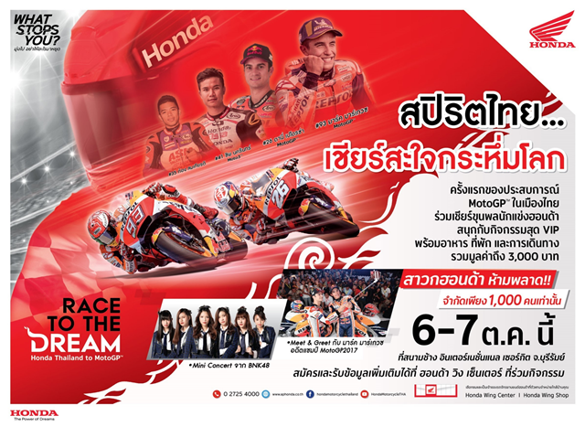 A.P. Honda ขอเชิญคนไทยร่วมแสดงพลังกองเชียร์เจ้าบ้าน อย่าพลาด! ที่จะเป็นส่วนหนึ่งของหน้าประวัติศาสตร์ครั้งนี้ เพื่ออวดสายตาให้ทั่วโลกได้เห็นถึงศักยภาพของคนไทยโดย A.P. Honda ร่วมกับร้านผู้จำหน่ายรถจักรยานยนต์ฮอนด้าที่ร่วมกิจกรรม จัดทริปพิเศษพาสมาชิกฮอนด้าคลับเข้าชมการแข่งขันแบบติดขอบสนาม พร้อมกิจกรรมพิเศษ Meet & Greet กับนักแข่งระดับโลก และ ชมคอนเสิร์ตจากศิลปินไอดอล Girl Group ชื่อดังของประเทศไทย BNK48 โดยผู้ที่สนใจสามารถติดต่อสอบถามได้ที่ร้านผู้จำหน่ายรถจักรยานยนต์ฮอนด้าที่ร่วมกิจกรรมได้แล้วตั้งแต่วันนี้เป็นต้นไป