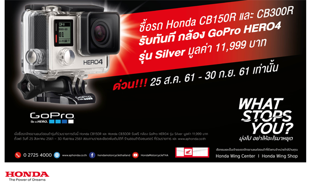 รถจักรยานยนต์ฮอนด้า ตอกย้ำคอนเซปต์ "WHAT STOPS YOU? มุ่งไป อย่าให้อะไรมาหยุด" มอบความพิเศษเอาใจสาวก "Neo Sports Cafe" ด้วยการขยายเวลาโปรโมชั่น "Welcome To CB World" สำหรับใครที่ออกรถใหม่ 2 รุ่นยอดนิยม Honda CB150R และ Honda CB300R วันนี้ รับทันที กล้อง GoPro HERO 4 Silver Edition รุ่นใหม่ล่าสุด มูลค่า 11,990 บาท ฟรี!หมดเขต 30 กันยายน 2561 เฉพาะที่ศูนย์บริการ Honda Wing Center ที่ร่วมรายการทั่วประเทศ ไบค์เกอร์ที่หลงใหลการขับขี่สายหล่อเท่สไตล์ Neo Sports Cafe ไม่ควรพลาด