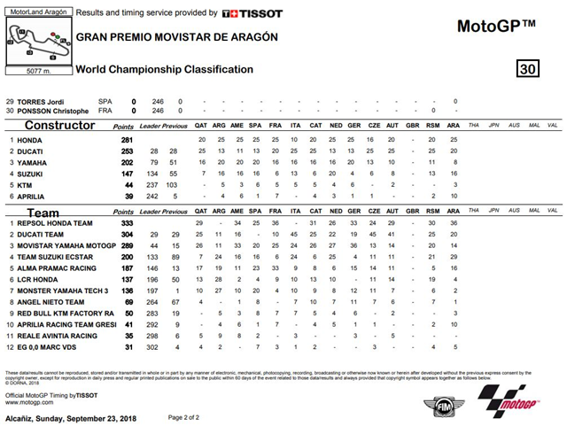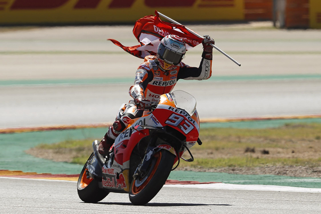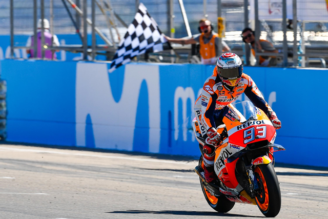 แต่ในช่วงท้ายๆ ของการแข่งขันก็ได้เวลาที่ Marquez จะบู๊ เพื่อตำแหน่งชนะเลิศ มีจังหวะที่ โดนทั้ง Ducati และ Suzuki ประกบแย่งตำแหน่ง แต่ด้วยความคงเส้นคงวา และการปรับพฤติกรรมการขับขี่ที่สุขุมมากขึ้น สุดท้ายเลยเป็น Marquez ที่สามารถคว้าตำแหน่งแชมป์ประจำสนามที่ 14 ไปได้สำเร็จ ส่วน Dovizioso ได้อันดับที่ 2 และ Iannonoe ได้อันดับที่ 3