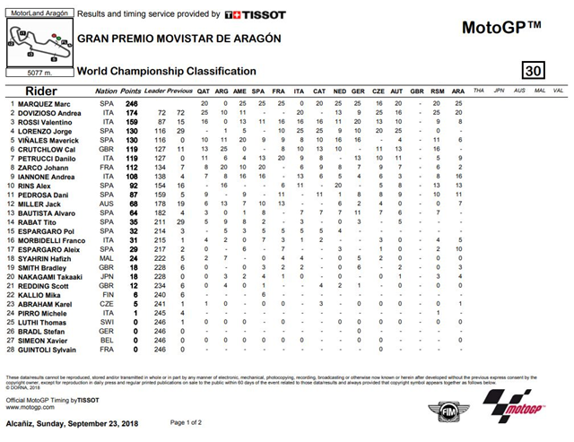 เมื่อดูคะแนนสะสมกับจำนวนสนามการแข่งขันที่เหลืออยู่ของ MotoGP 2018 ก็เหมือนจะเห็นแววแล้วว่าปีนี้ใครจะเป็นแชมป์ประจำปี เพราะเหลืออีกเพียง 5 สนามเท่านั้น