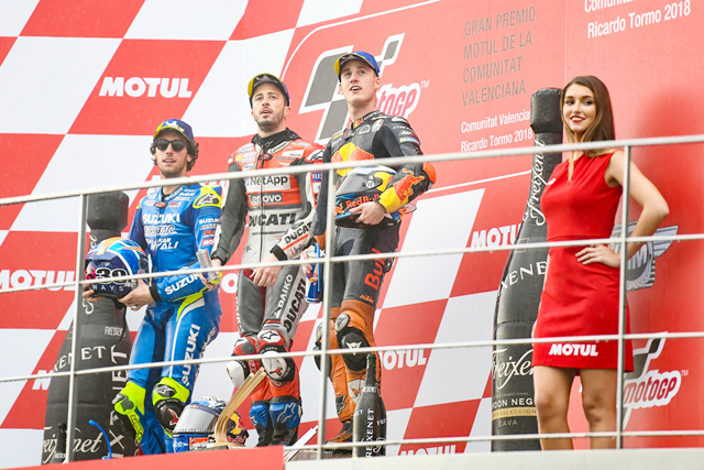 ปิดท้ายฤดูกาลสำหรับ MotoGP 2018 ในสนามสุดท้ายกันในสนามที่ 18 รายการ Grand Premio Motul De La Comunitat Valenciana ที่สนาม Circuit Ricardo Tormo ประเทศสเปน สนามแห่งนี้สร้างขึ้นในปี 1999 เป็นสนามที่มีความยาว 4 กิโลเมตร มีโค้งขวาทั้งหมด 5 โค้ง และโค้งซ้ายทั้งหมด 9 โค้ง โดยการแข่งขันในสนามนี้ต้องเจอ "ฝน" แทบจะตลอดการแข่งขัน ทำให้นักขับชื่อดังหลายๆ ราย พลาดล้มออกจากการแข่งขันกันไป ไม่ว่าจะเป็น Vinales จาก Movistar Yamaha MotoGP, Iannone จาก Team Suzuki Ecstar กระทั่งแชมป์โลกคนล่าสุดอย่าง Marquez จาก Repsol Honda Team ก็ยังพลาดล้มออกจากการแข่งขัน