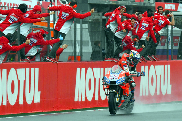 กลายเป็น Dovizioso ที่ทำผลงานกับสนามเปียกได้โดดเด่นกว่าขึ้นมาเป็นผู้นำ ปล่อยให้ Rins และ Rossi ห่ำหั่นกันต่อ จนท้ายที่สุดกลายเป็น Rossi ที่พลาดล้มเสียอันดับแต่กลับเข้าร่วมการแข่งขันได้ต่อ จนถึงรอบสุดท้ายกลายเป็น Dovizioso จาก Ducati Team ที่คว้าแชมป์ในสนามสุดท้าย ตามมาด้วย Rins จาก Team Suzuki Ecstar ส่วนอันดับ 3 กลายเป็น Pol Espaargaro จาก Red Bull KTM Factory Racing ที่ดีใจยิ่งกว่าใครเพราะเป็นการพา KTM ขึ้นโพเดี้ยมแรกในรุ่นใหญ่อย่าง MotoGP