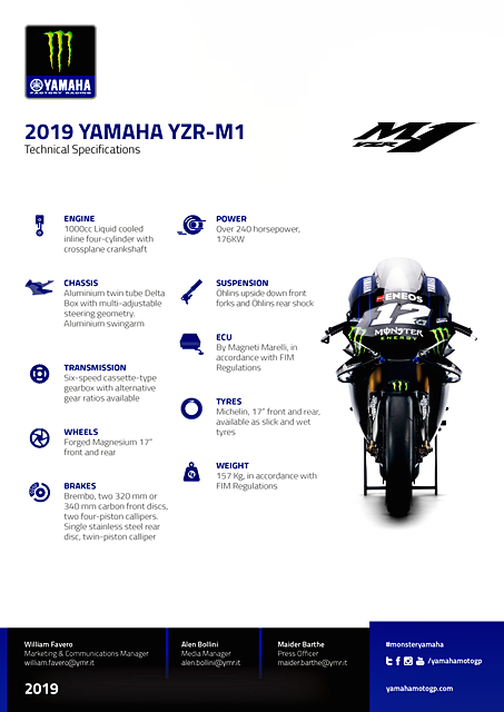 ยามาฮ่า เปิดตัว Monster Energy Yamaha MotoGP Team ทีมแข่งโมโตจีพีพร้อมรถแข่งฤดูกาล 2019 ที่โรงแรมโฟว์ซีซั่น จาร์กาตา ประเทศอินโดนิเซีย เมื่อวันที่ 4 กุมภาพันธ์ที่ผ่านมา โดยปีนี้สปอนเซอร์หลักเปลี่ยนเป็นเครื่องดื่ม Monster Energy หลังจากที่ได้สนับสนุนทีมมาตั้งแต่ปี 2013 รวมไปถึงการสนับสนุน 2 นักแข่งของทีมทั้ง วาเลนติโน่ รอสซี่ และมาเวอริค บีญาเลส