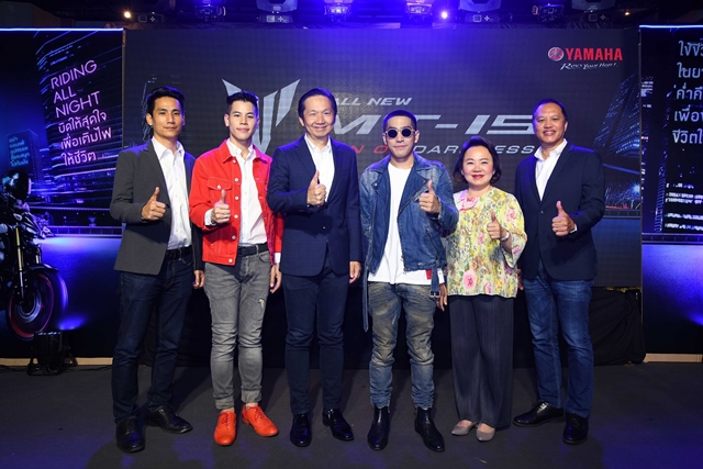 นายพงศธร เอื้อมงคลชัย รองประธานกรรมการบริหาร พร้อมผู้ด้วยบริหารระดับสูง บริษัท ไทยยามาฮ่ามอเตอร์ จำกัด ถ่ายภาพร่วมกับ นายพิทวัส พฤกษกิจ หรือ "โต้ง" TWOPEE SouthSide ในงานแถลงข่าวเปิดตัวหนังโฆษณาชุดใหม่ พร้อมมิวสิควีดีโอ Yamaha MT-15