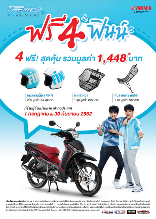 สำหรับโปรโมชั่นพิเศษที่ ยามาฮ่า มอบให้กับลูกค้าที่ซื้อรถจักรยานยนต์ยามาฮ่า ฟินน์ ทุกคัน รับฟรีหมวกกันน็อกฟินน์ 2 ใบ รวมถึงตะกร้าหน้าแบบตาข่ายสีดำ 1 ชุด และกันลายแบบตาข่ายสีดำ 1 ชุด รวมมูลค่าถึง 1,488 บาท สัมผัสความ "ฟินน์" ได้ที่ร้านผู้จำหน่ายรถจักรยานยนต์ยามาฮ่าทั่วประเทศ ตั้งแต่วันที่ 1 กรกฎาคม ถึง 30 กันยายน 2562 นี้