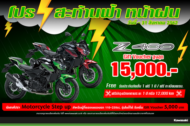 *Motorcycle Step up : Z400 / Z400 SE มีโปรโมชั่น Motorcycle Step up สำหรับผู้ที่ครอบครองรถ 110-250 cc. รุ่นใดก็ได้จะได้รับ Gift Voucher มูลค่า 5,000 บาท