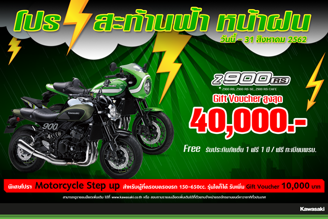 *Motorcycle Step up : Z900RS/ Z900RS SE/ Z900RS CAFE มีโปรโมชั่น Motorcycle Step up สำหรับผู้ที่ครอบครองรถ 150 - 650 cc. รุ่นใดก็ได้จะได้รับ Gift Voucher มูลค่า 10,000 บาท