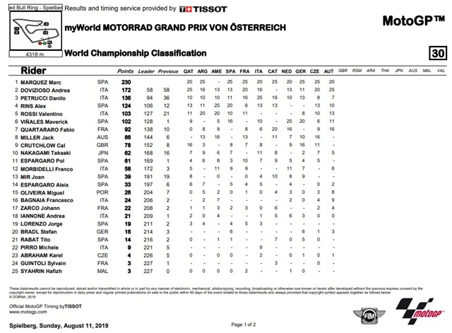 ผลการแข่งขัน MotoGP รายการ myWorld MOTORRAD GRAND PRIX VON OSTERREICH ที่สนาม Red Bull Ring